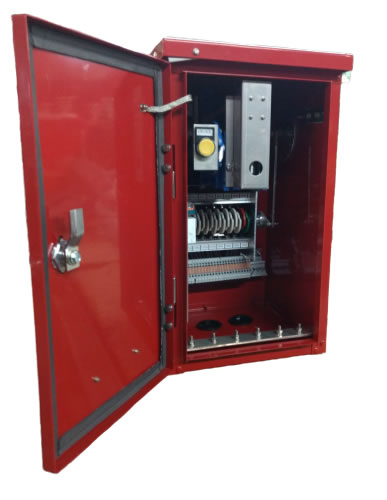 Armario metálico inoxidable con protección IP54 según IEC 60529. Acabado en blanco para mando principal y en rojo para mando PAT.