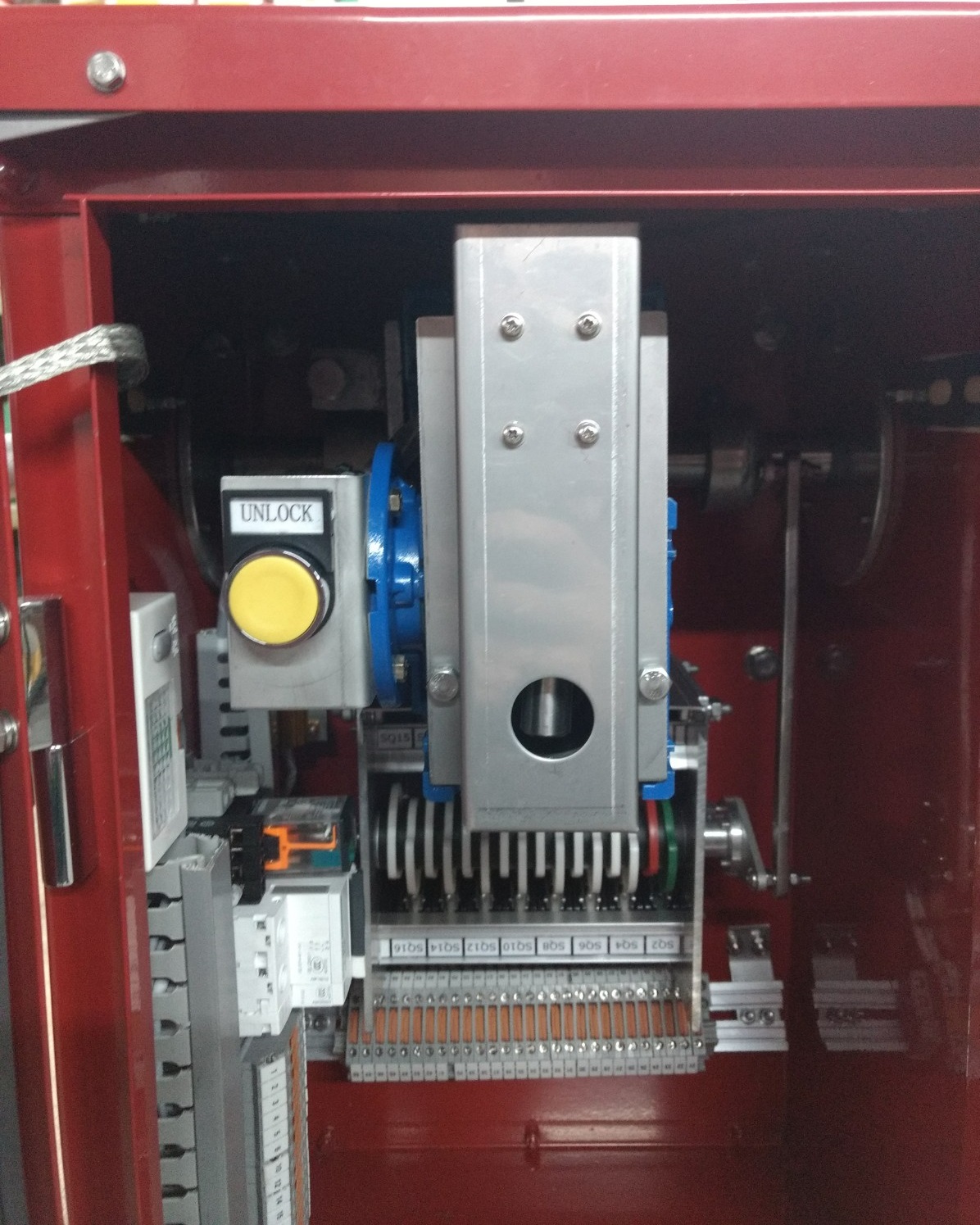 La unión con el seccionador se realiza por medio de una tubería de tracción que se acopla a alguno de los dos bulones de salida situados en los laterales del mando. El mando manual y todo el conjunto de control y protección están colocados dentro de un armario previsto para su utilización en intemperie.