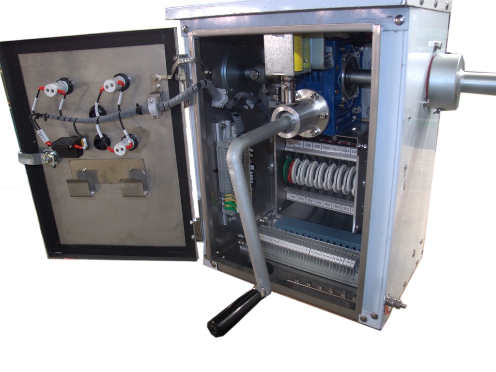 La unión con el seccionador se realiza por medio de una tubería de tracción que se acopla a alguno de los dos bulones de salida situados en los laterales del mando. El mando manual y todo el conjunto de control y protección están colocados dentro de un armario previsto para su utilización en intemperie.