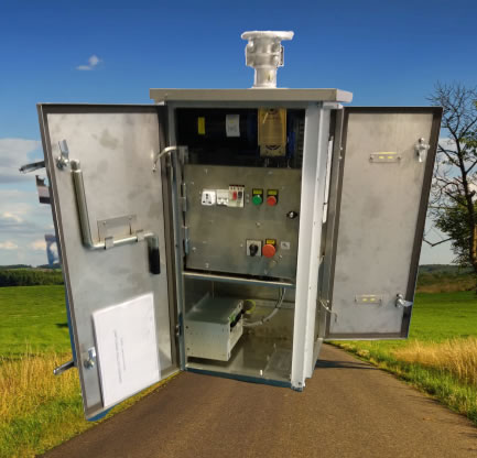 Armario metálico con protección IP54, S/CEI 144. posibilidad de cierre mediante candado o cerradura. motorreductor de 48 VCC con doble reducción corona-sinfín y embrague intermedio para el accionamiento manual.